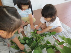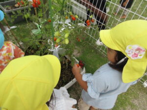 園庭のプランターに、ミニトマトや枝豆がたくさんの実をつけたので、みんなで収穫しました。