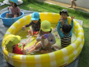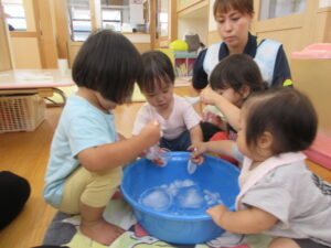 暑い毎日、寒天や氷でひんやり… 冷たい感触を味わったり、プールあそびも楽しんだね(*^-^*)